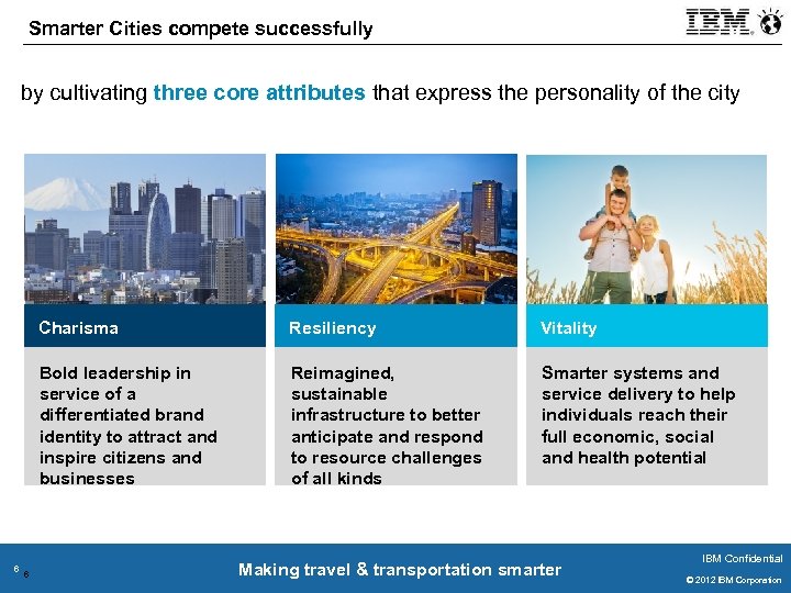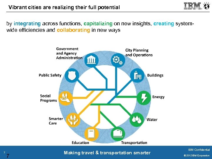 Smarter Cities compete successfully by cultivating three core attributes that express the personality of the city Charisma 6 Vitality Bold leadership in service of a differentiated brand identity to attract and inspire citizens and businesses 6 Resiliency Reimagined, sustainable infrastructure to better anticipate and respond to resource challenges of all kinds Smarter systems and service delivery to help individuals reach their full economic, social and health potential Making travel & transportation smarter IBM Confidential © 2011 IBM Corporation © 2012 IBM Corporation