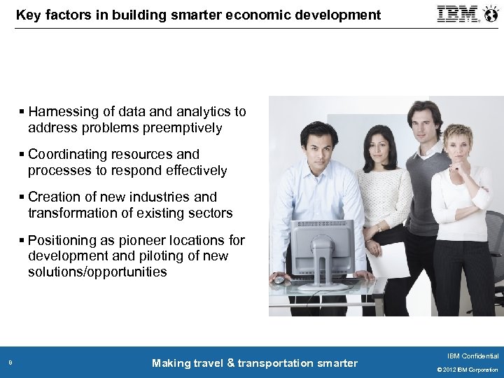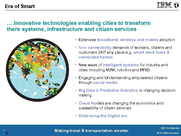 Key factors in building smarter economic development § Harnessing of data and analytics to address problems preemptively § Coordinating resources and processes to respond effectively § Creation of new industries and transformation of existing sectors § Positioning as pioneer locations for development and piloting of new solutions/opportunities 8 Making travel & transportation smarter IBM Confidential © 2011 IBM Corporation © 2012 IBM Corporation