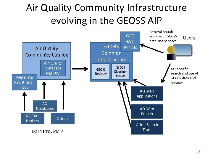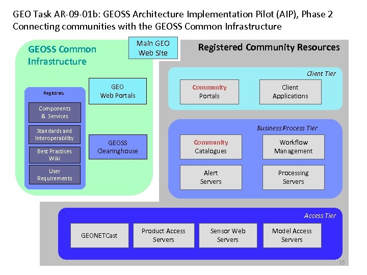 GEO Task AR-09 -01 b: GEOSS Architecture Implementation Pilot (AIP), Phase 2 Connecting communities with the GEOSS Common Infrastructure Main GEO Web Site GEOSS Common Infrastructure Registered Community Resources Client Tier Registries GEO Web Portals Community Portals Client Applications Components & Services Standards and Interoperability Best Practices Wiki Business Process Tier Community Catalogues User Requirements Workflow Management Alert Servers GEOSS Clearinghouse Processing Servers Access Tier GEONETCast Product Access Servers Sensor Web Servers Model Access Servers 15
