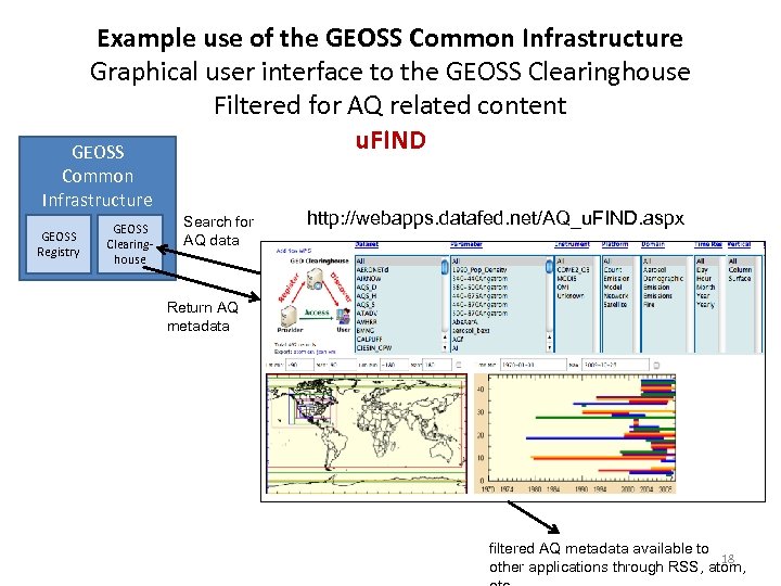 Example use of the GEOSS Common Infrastructure Graphical user interface to the GEOSS Clearinghouse Filtered for AQ related content u. FIND GEOSS Common Infrastructure GEOSS Registry GEOSS Clearinghouse Search for AQ data http: //webapps. datafed. net/AQ_u. FIND. aspx Return AQ metadata filtered AQ metadata available to 18 other applications through RSS, atom,