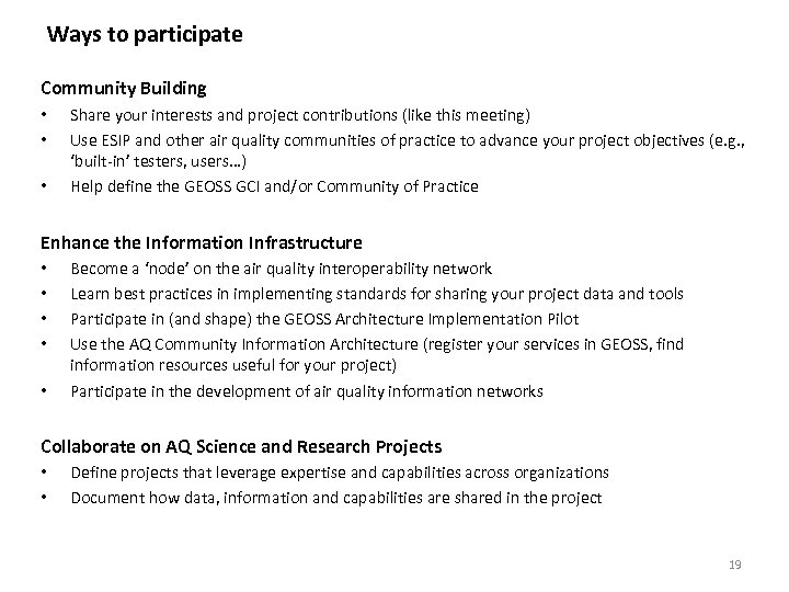 Ways to participate Community Building • • • Share your interests and project contributions (like this meeting) Use ESIP and other air quality communities of practice to advance your project objectives (e. g. , ‘built-in’ testers, users…) Help define the GEOSS GCI and/or Community of Practice Enhance the Information Infrastructure • • • Become a ‘node’ on the air quality interoperability network Learn best practices in implementing standards for sharing your project data and tools Participate in (and shape) the GEOSS Architecture Implementation Pilot Use the AQ Community Information Architecture (register your services in GEOSS, find information resources useful for your project) Participate in the development of air quality information networks Collaborate on AQ Science and Research Projects • • Define projects that leverage expertise and capabilities across organizations Document how data, information and capabilities are shared in the project 19