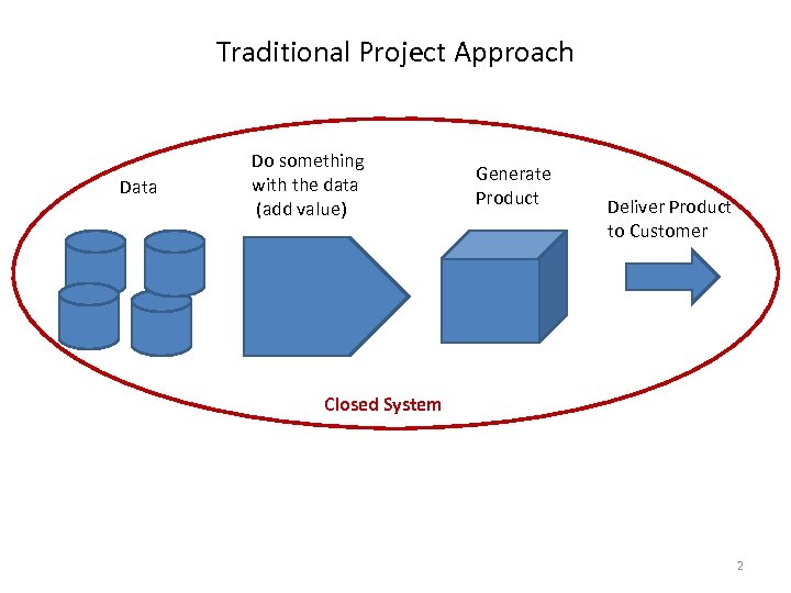 Traditional Project Approach Data Do something with the data (add value) Generate Product Deliver Product to Customer Closed System 2