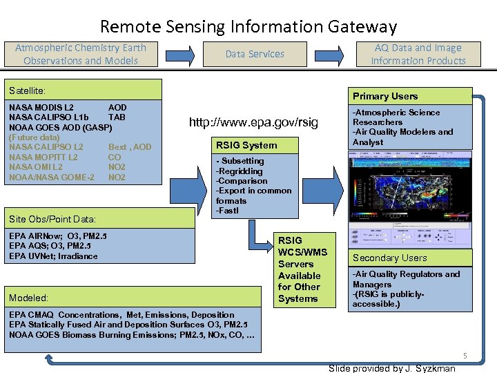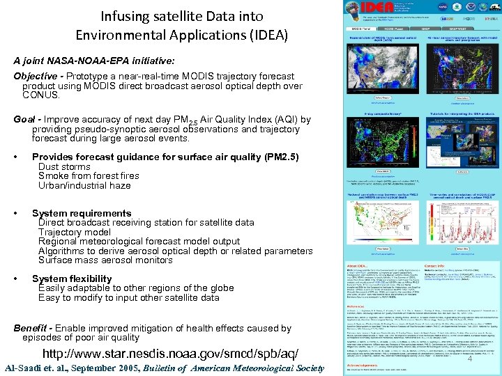 Infusing satellite Data into Environmental Applications (IDEA) A joint NASA-NOAA-EPA initiative: Objective - Prototype a near-real-time MODIS trajectory forecast product using MODIS direct broadcast aerosol optical depth over CONUS. Goal - Improve accuracy of next day PM 2. 5 Air Quality Index (AQI) by providing pseudo-synoptic aerosol observations and trajectory forecast during large aerosol events. • Provides forecast guidance for surface air quality (PM 2. 5) Dust storms Smoke from forest fires Urban/industrial haze • System requirements Direct broadcast receiving station for satellite data Trajectory model Regional meteorological forecast model output Algorithms to derive aerosol optical depth or related parameters Surface mass aerosol monitors • System flexibility Easily adaptable to other regions of the globe Easy to modify to input other satellite data Benefit - Enable improved mitigation of health effects caused by episodes of poor air quality http: //www. star. nesdis. noaa. gov/smcd/spb/aq/ Al-Saadi et. al. , September 2005, Bulletin of American Meteorological Society 4