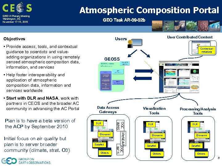 GEO-VI Plenary Meeting Washington, DC November 17 -18, 2009 Atmospheric Composition Portal GEO Task AR-09 -02 b Objectives User Contributed Content Users • Provide access, tools, and contextual guidance to scientists and valueadding organizations in using remotely sensed atmospheric composition data, information, and services Contextual metadata GEOSS • Help foster interoperability and application of atmospheric composition data, information and services worldwide • Start with DLR and NASA, work with partners in CEOS and the broader AC community in advancing the AC Portal Initial focus on air quality but plan is to server broader community (climate, strat. O 3) DLR Giovanni Datafed Others OGC OPe. NDAP OGC WMS WCS Plan is to have a beta version of the ACP by September 2010 Data Access Gateways Visualization Tools DLR Giovanni Datafed Others Processing/Analysis Tools DLR Giovanni Datafed Others 8