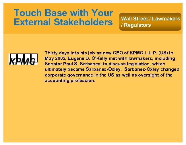 Touch Base with Your External Stakeholders Wall Street / Lawmakers / Regulators Thirty days into his job as new CEO of KPMG L. L. P. (US) in May 2002, Eugene D. O’Kelly met with lawmakers, including Senator Paul S. Sarbanes, to discuss legislation, which ultimately became Sarbanes-Oxley changed corporate governance in the US as well as oversight of the accounting profession.