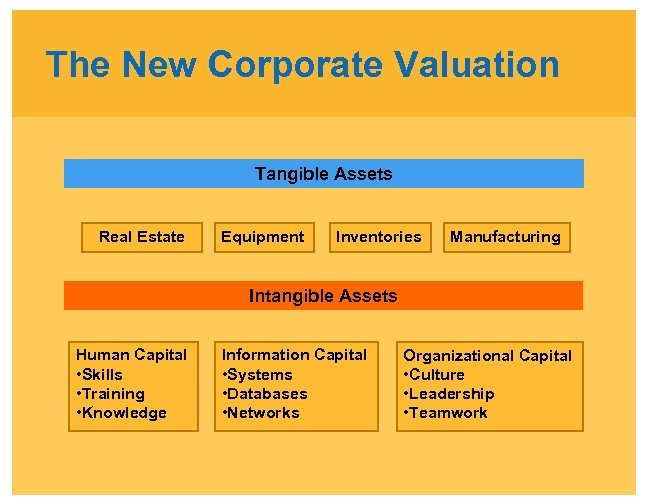 The New Corporate Valuation Tangible Assets Real Estate Equipment Inventories Manufacturing Intangible Assets Human Capital • Skills • Training • Knowledge Information Capital • Systems • Databases • Networks Organizational Capital • Culture • Leadership • Teamwork