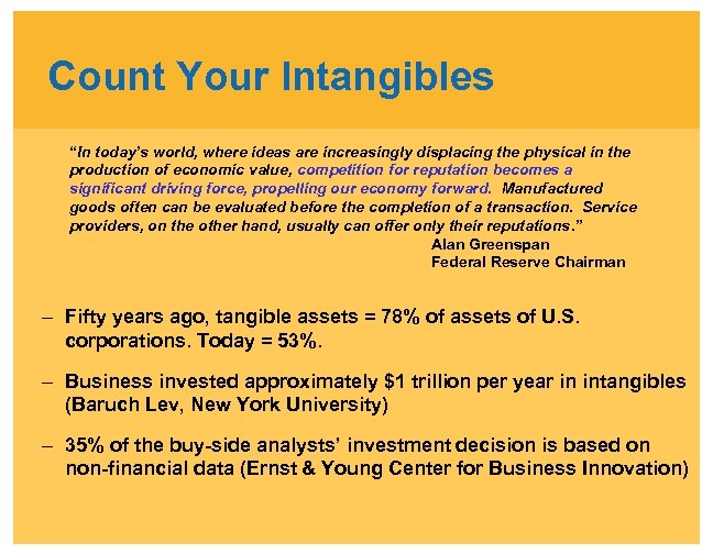 Count Your Intangibles “In today’s world, where ideas are increasingly displacing the physical in the production of economic value, competition for reputation becomes a significant driving force, propelling our economy forward. Manufactured goods often can be evaluated before the completion of a transaction. Service providers, on the other hand, usually can offer only their reputations. ” Alan Greenspan Federal Reserve Chairman – Fifty years ago, tangible assets = 78% of assets of U. S. corporations. Today = 53%. – Business invested approximately $1 trillion per year in intangibles (Baruch Lev, New York University) – 35% of the buy-side analysts’ investment decision is based on non-financial data (Ernst & Young Center for Business Innovation)
