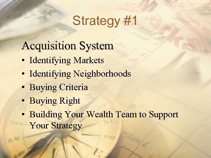 Strategy #1 Acquisition System • • • Identifying Markets Identifying Neighborhoods Buying Criteria Buying Right Building Your Wealth Team to Support Your Strategy