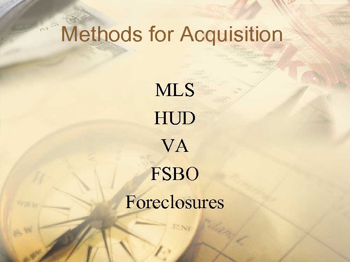 Methods for Acquisition MLS HUD VA FSBO Foreclosures
