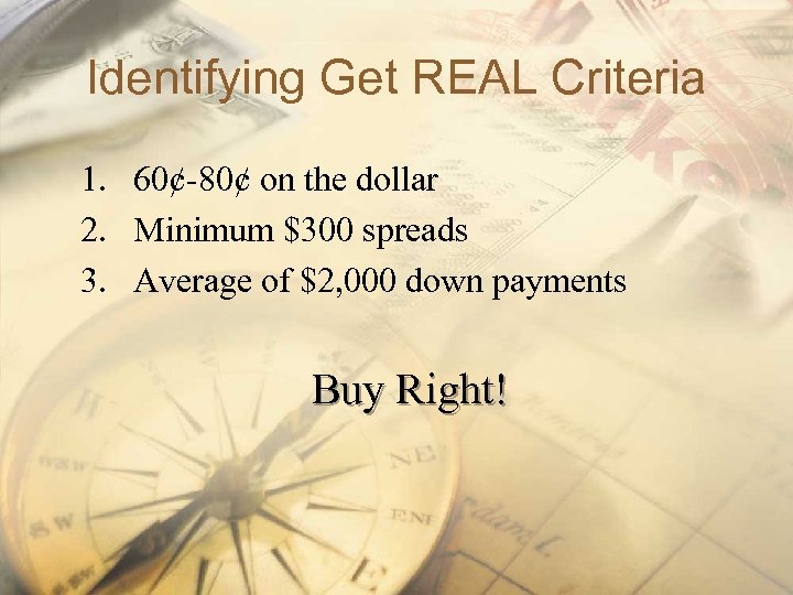 Identifying Get REAL Criteria 1. 60¢-80¢ on the dollar 2. Minimum $300 spreads 3. Average of $2, 000 down payments Buy Right!