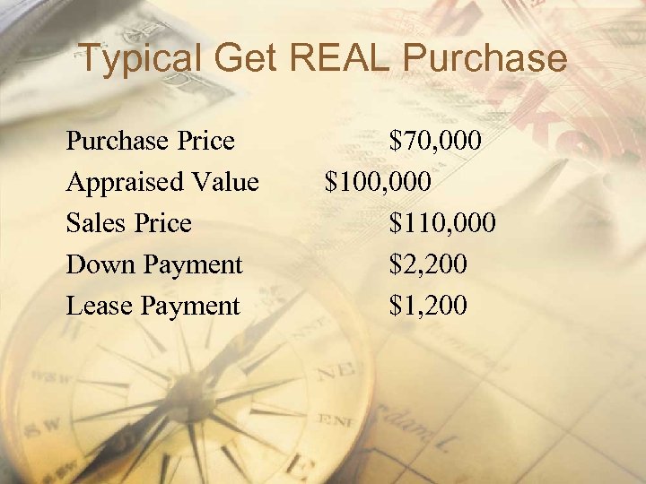 Typical Get REAL Purchase Price Appraised Value Sales Price Down Payment Lease Payment $70, 000 $100, 000 $110, 000 $2, 200 $1, 200