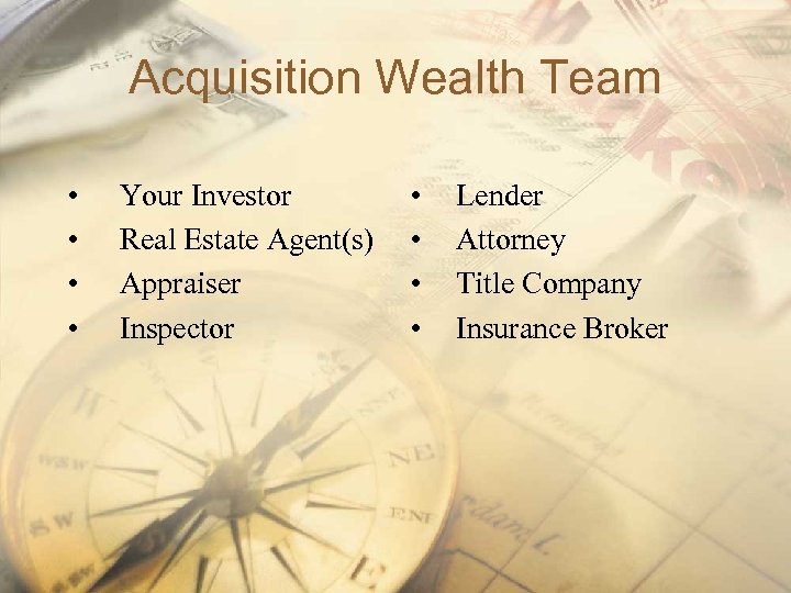 Acquisition Wealth Team • • Your Investor Real Estate Agent(s) Appraiser Inspector • • Lender Attorney Title Company Insurance Broker