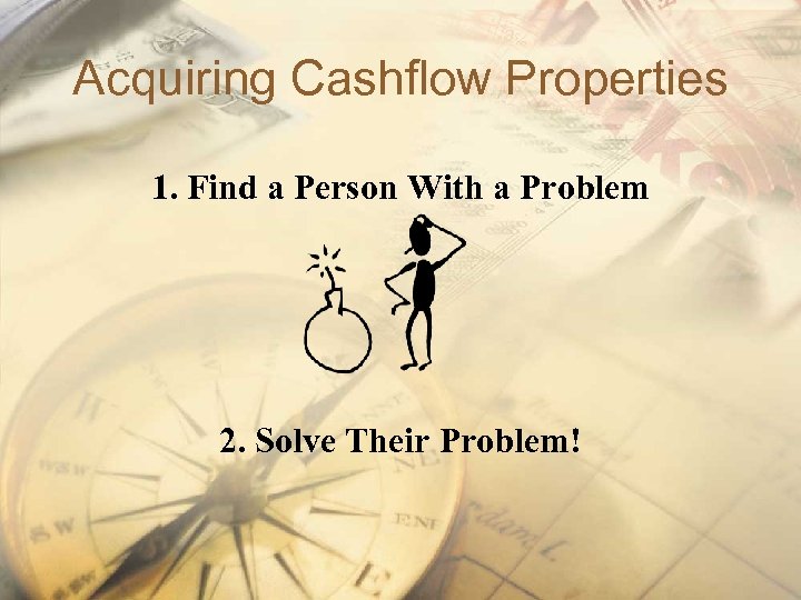 Acquiring Cashflow Properties 1. Find a Person With a Problem 2. Solve Their Problem!