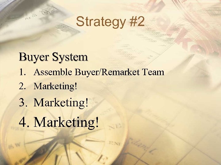 Strategy #2 Buyer System 1. Assemble Buyer/Remarket Team 2. Marketing! 3. Marketing! 4. Marketing!