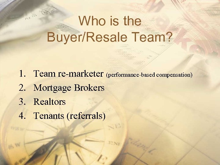 Who is the Buyer/Resale Team? 1. 2. 3. 4. Team re-marketer (performance-based compensation) Mortgage Brokers Realtors Tenants (referrals)