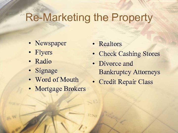Re-Marketing the Property • • • Newspaper Flyers Radio Signage Word of Mouth Mortgage Brokers • Realtors • Check Cashing Stores • Divorce and Bankruptcy Attorneys • Credit Repair Class