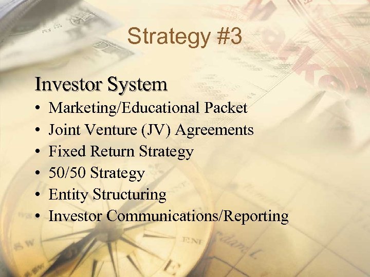 Strategy #3 Investor System • • • Marketing/Educational Packet Joint Venture (JV) Agreements Fixed Return Strategy 50/50 Strategy Entity Structuring Investor Communications/Reporting