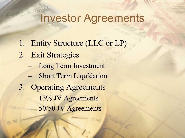 Investor Agreements 1. Entity Structure (LLC or LP) 2. Exit Strategies – Long Term Investment – Short Term Liquidation 3. Operating Agreements – 13% JV Agreements – 50/50 JV Agreements