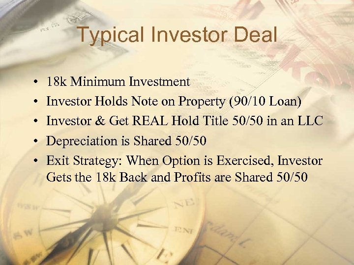 Typical Investor Deal • • • 18 k Minimum Investment Investor Holds Note on Property (90/10 Loan) Investor & Get REAL Hold Title 50/50 in an LLC Depreciation is Shared 50/50 Exit Strategy: When Option is Exercised, Investor Gets the 18 k Back and Profits are Shared 50/50
