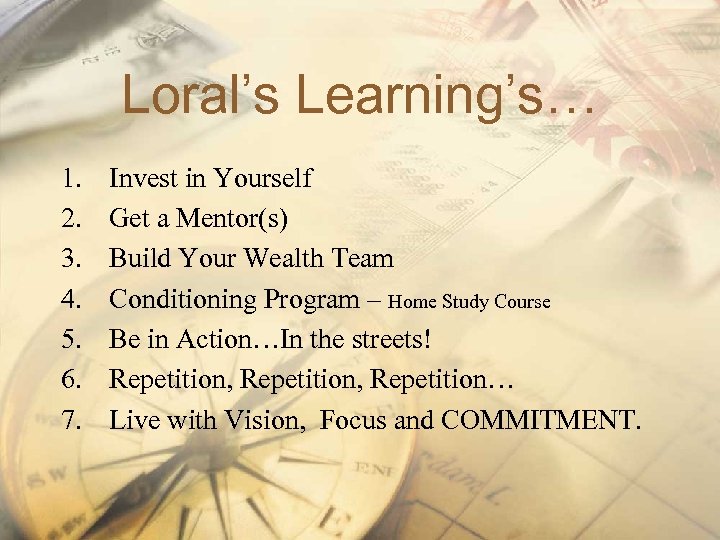 Loral’s Learning’s… 1. 2. 3. 4. 5. 6. 7. Invest in Yourself Get a Mentor(s) Build Your Wealth Team Conditioning Program – Home Study Course Be in Action…In the streets! Repetition, Repetition… Live with Vision, Focus and COMMITMENT.