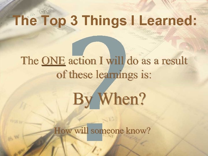 ? The Top 3 Things I Learned: The ONE action I will do as a result of these learnings is: By When? How will someone know?
