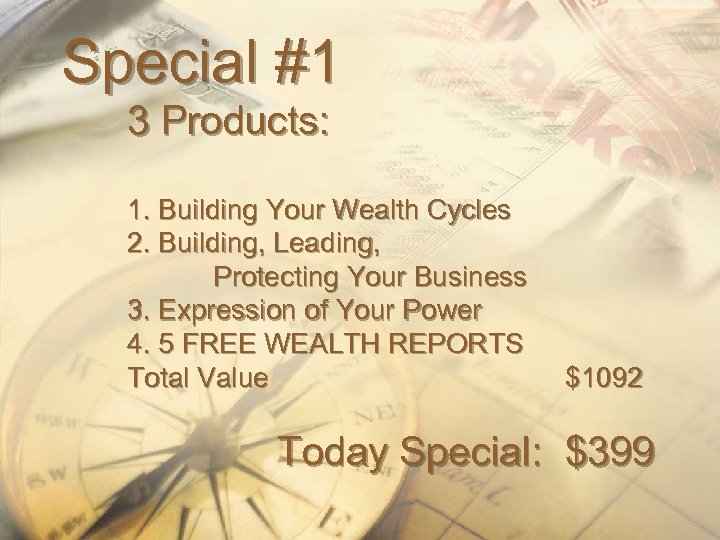 Special #1 3 Products: 1. Building Your Wealth Cycles 2. Building, Leading, Protecting Your Business 3. Expression of Your Power 4. 5 FREE WEALTH REPORTS Total Value $1092 Today Special: $399
