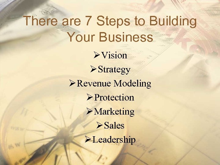 There are 7 Steps to Building Your Business Ø Vision Ø Strategy Ø Revenue Modeling Ø Protection Ø Marketing Ø Sales Ø Leadership