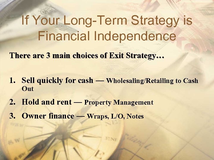 If Your Long-Term Strategy is Financial Independence There are 3 main choices of Exit Strategy… 1. Sell quickly for cash — Wholesaling/Retailing to Cash Out 2. Hold and rent — Property Management 3. Owner finance — Wraps, L/O, Notes