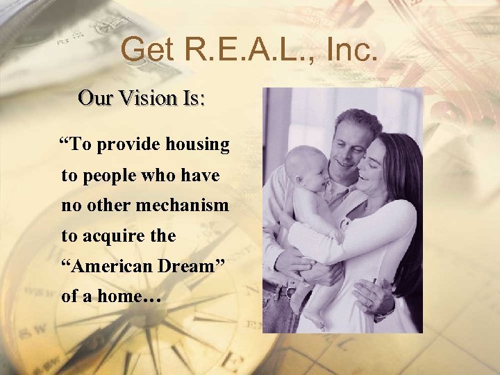 Get R. E. A. L. , Inc. Our Vision Is: “To provide housing to people who have no other mechanism to acquire the “American Dream” of a home…