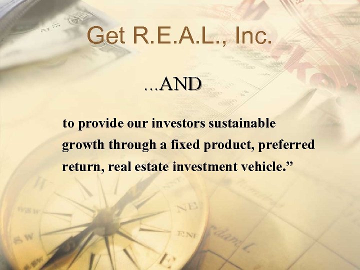 Get R. E. A. L. , Inc. …AND to provide our investors sustainable growth through a fixed product, preferred return, real estate investment vehicle. ”