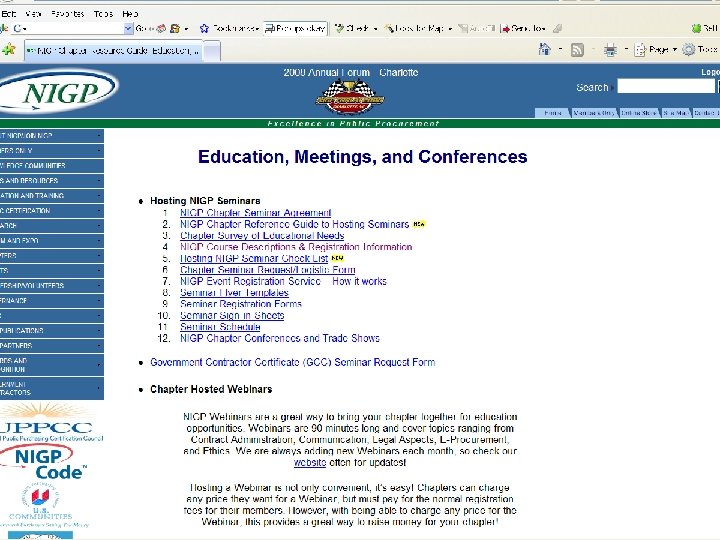 Governmental Contract Certificate (GCC) The GCC Program provides suppliers who desire a greater awareness of public procurement processes and the government purchasing environment. • • Host GCC courses during a chapter conference or stand alone event Earn revenue for the chapter almost $100 per attendee The Four Core: The Two Electives ► Introduction and Concepts to Public Purchasing ► Legal Aspects ► Sourcing: Solicitation, Evaluation, Award ► RFP’s-From Both Sides ► Government Sales ► Contract Administration for Suppliers Contact Michael Romero at mromero@nigp. org or call 800 -367 -6447 ext 248