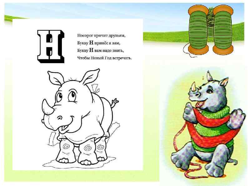 Носорог кричит друзьям, Букву Н принёс я вам, Букву Н вам надо знать, Чтобы Новый год встречать.