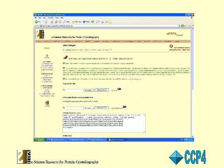 e-HTPX Jobs can be submitted via the e-HPTX portal to the Daresbury e-HTPX computational resources (cluster or condor pool) or, if the user has a Grid Certificate, to the UK National Grid Resources. Users can monitor the job results as they are produced via a web page hosted on the e-HTPX server machine and they are notified by email when their job is complete. Refined structure files are made available to user for downloading upon completion. First external user as of a couple of days ago!