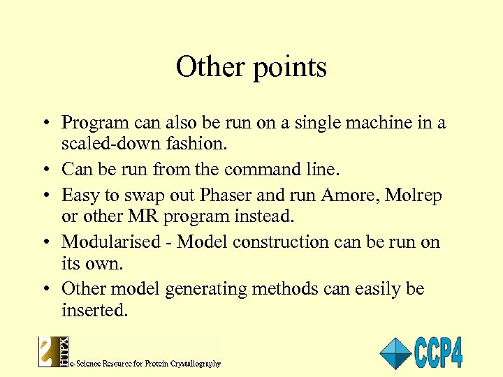 Other points • Program can also be run on a single machine in a scaled-down fashion. • Can be run from the command line. • Easy to swap out Phaser and run Amore, Molrep or other MR program instead. • Modularised - Model construction can be run on its own. • Other model generating methods can easily be inserted.