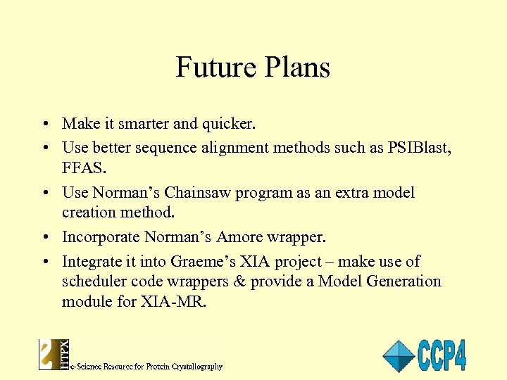 Future Plans • Make it smarter and quicker. • Use better sequence alignment methods such as PSIBlast, FFAS. • Use Norman’s Chainsaw program as an extra model creation method. • Incorporate Norman’s Amore wrapper. • Integrate it into Graeme’s XIA project – make use of scheduler code wrappers & provide a Model Generation module for XIA-MR.
