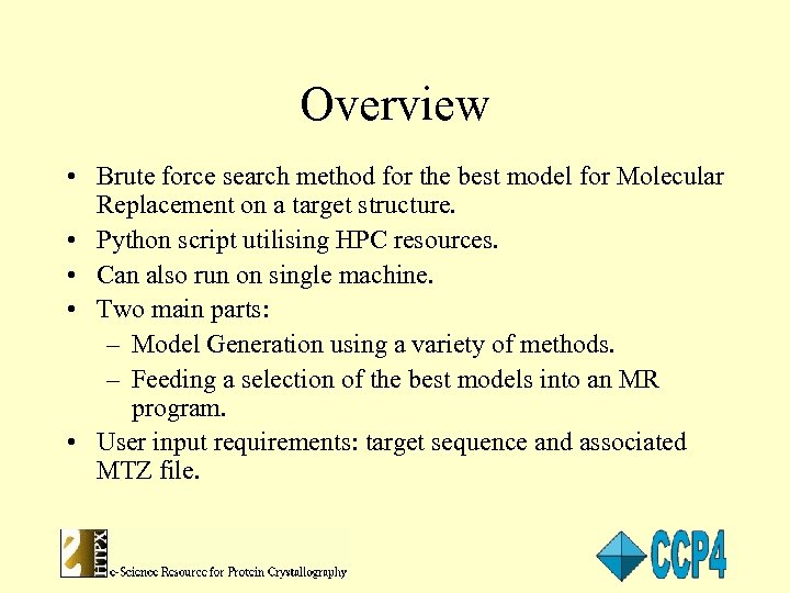 Overview • Brute force search method for the best model for Molecular Replacement on a target structure. • Python script utilising HPC resources. • Can also run on single machine. • Two main parts: – Model Generation using a variety of methods. – Feeding a selection of the best models into an MR program. • User input requirements: target sequence and associated MTZ file.