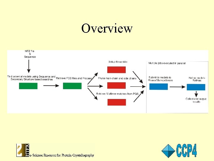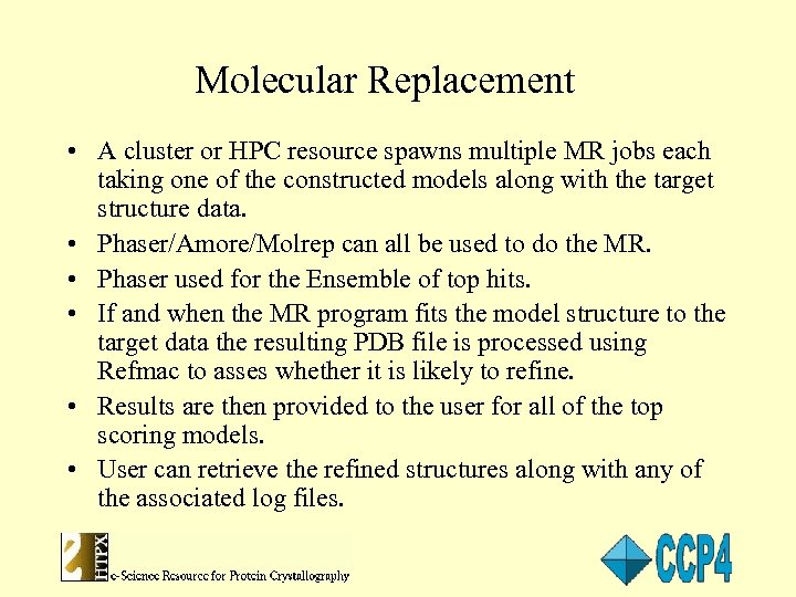 Molecular Replacement • A cluster or HPC resource spawns multiple MR jobs each taking one of the constructed models along with the target structure data. • Phaser/Amore/Molrep can all be used to do the MR. • Phaser used for the Ensemble of top hits. • If and when the MR program fits the model structure to the target data the resulting PDB file is processed using Refmac to asses whether it is likely to refine. • Results are then provided to the user for all of the top scoring models. • User can retrieve the refined structures along with any of the associated log files.