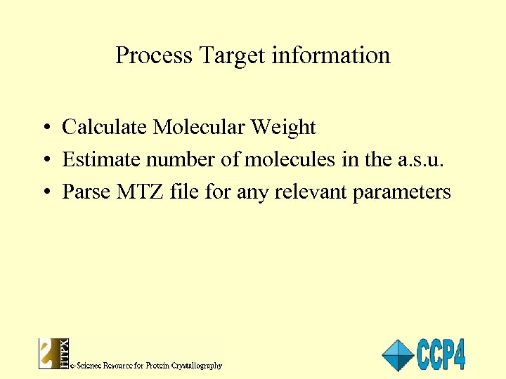 Process Target information • Calculate Molecular Weight • Estimate number of molecules in the a. s. u. • Parse MTZ file for any relevant parameters