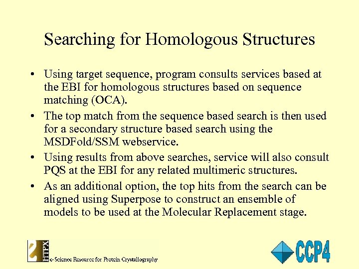 Searching for Homologous Structures • Using target sequence, program consults services based at the EBI for homologous structures based on sequence matching (OCA). • The top match from the sequence based search is then used for a secondary structure based search using the MSDFold/SSM webservice. • Using results from above searches, service will also consult PQS at the EBI for any related multimeric structures. • As an additional option, the top hits from the search can be aligned using Superpose to construct an ensemble of models to be used at the Molecular Replacement stage.