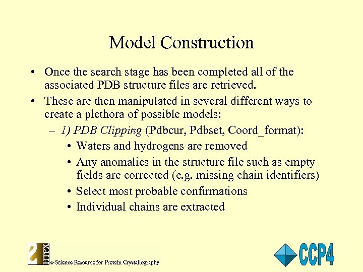 Model Construction • Once the search stage has been completed all of the associated PDB structure files are retrieved. • These are then manipulated in several different ways to create a plethora of possible models: – 1) PDB Clipping (Pdbcur, Pdbset, Coord_format): • Waters and hydrogens are removed • Any anomalies in the structure file such as empty fields are corrected (e. g. missing chain identifiers) • Select most probable confirmations • Individual chains are extracted