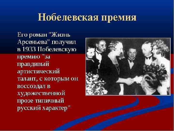 Биография писателя 10 октября 1870 год – 8 ноября 1953 год. Родился писатель в городе Воронеж. Умер писатель в городе Париж. Его псевдонимы: Озерский, И. ; Чубаров И. Годы его творчества: 1887 – 1953 гг. Лауреат Нобелевской премии по литературе – 1933 год Дважды лауреат Пушкинской премии – 1903 и 1909 годы.