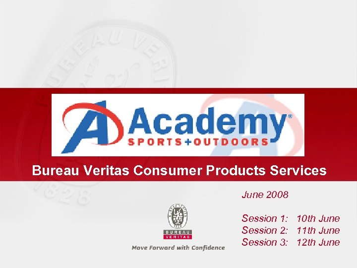 Bureau Veritas Consumer Products Services June 2008 Session 1: 10 th June Session 2: 11 th June Session 3: 12 th June