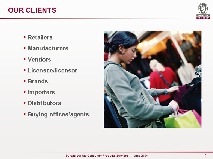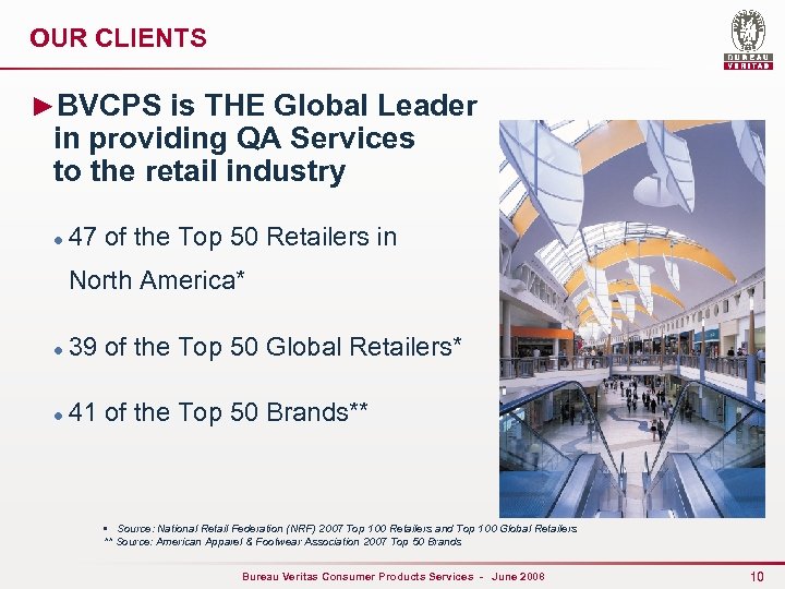 OUR CLIENTS • Retailers • Manufacturers • Vendors • Licensee/licensor • Brands • Importers • Distributors • Buying offices/agents Bureau Veritas Consumer Products Services - June 2008 9