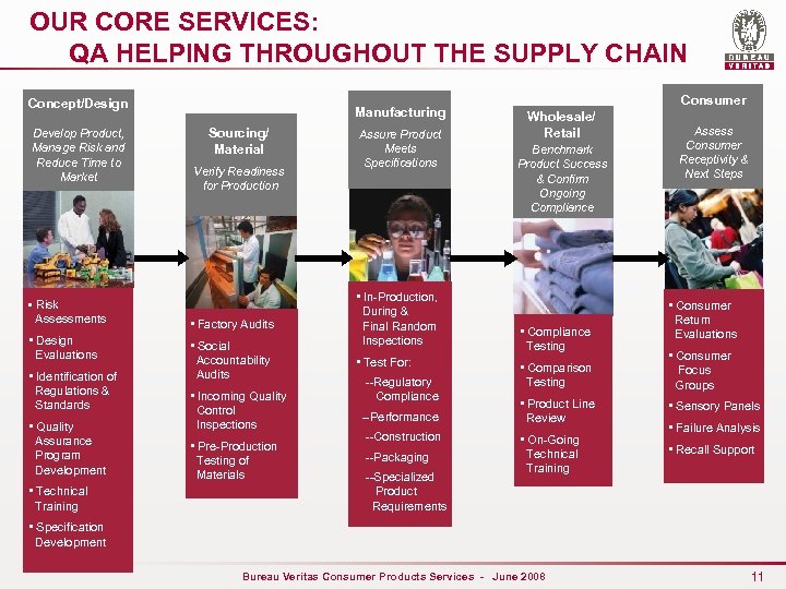 OUR CLIENTS ►BVCPS is THE Global Leader in providing QA Services to the retail industry l 47 of the Top 50 Retailers in North America* l 39 of the Top 50 Global Retailers* l 41 of the Top 50 Brands** • Source: National Retail Federation (NRF) 2007 Top 100 Retailers and Top 100 Global Retailers ** Source: American Apparel & Footwear Association 2007 Top 50 Brands Bureau Veritas Consumer Products Services - June 2008 10