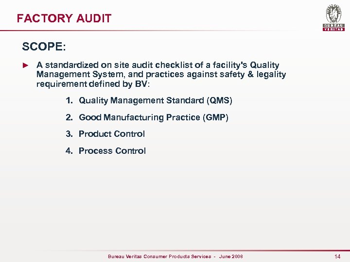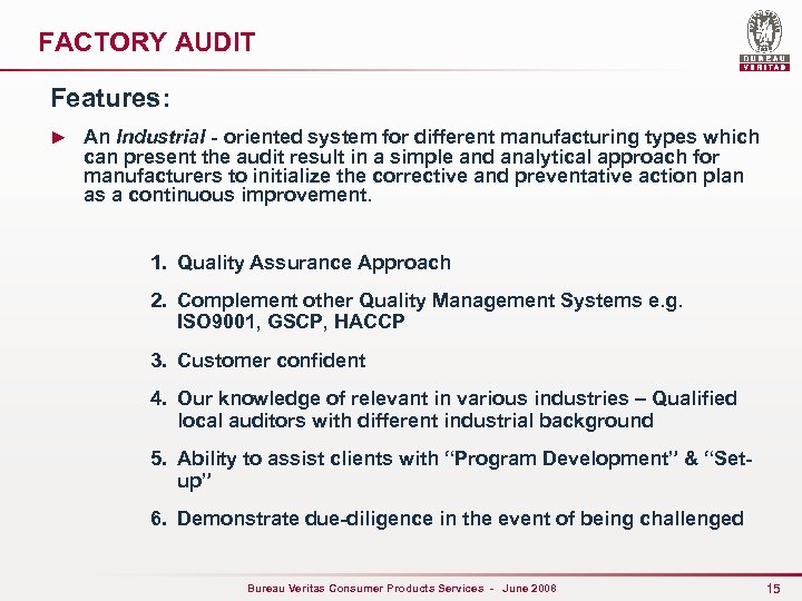 FACTORY AUDIT SCOPE: ► A standardized on site audit checklist of a facility's Quality Management System, and practices against safety & legality requirement defined by BV: 1. Quality Management Standard (QMS) 2. Good Manufacturing Practice (GMP) 3. Product Control 4. Process Control Bureau Veritas Consumer Products Services - June 2008 14