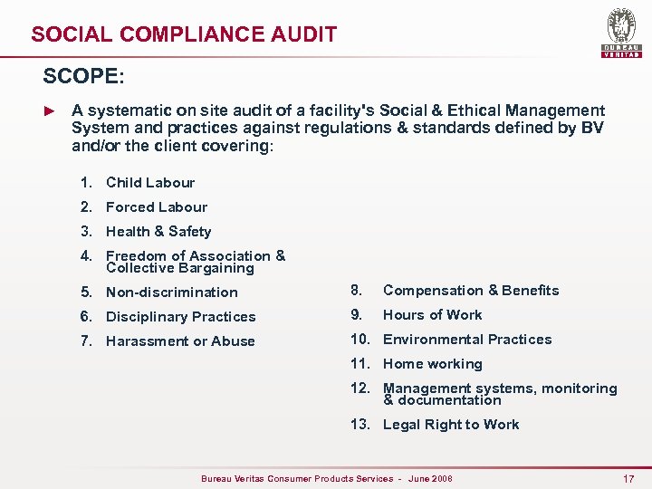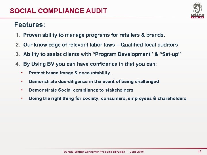 SOCIAL COMPLIANCE AUDIT SCOPE: ► A systematic on site audit of a facility's Social & Ethical Management System and practices against regulations & standards defined by BV and/or the client covering: 1. Child Labour 2. Forced Labour 3. Health & Safety 4. Freedom of Association & Collective Bargaining 5. Non-discrimination 8. Compensation & Benefits 6. Disciplinary Practices 9. Hours of Work 7. Harassment or Abuse 10. Environmental Practices 11. Home working 12. Management systems, monitoring & documentation 13. Legal Right to Work Bureau Veritas Consumer Products Services - June 2008 17
