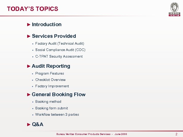 TODAY’S TOPICS ► Introduction ► Services Provided l Factory Audit (Technical Audit) l Social Compliance Audit (COC) l C-TPAT Security Assessment ► Audit Reporting l Program Features l Checklist Overview l Factory Improvement ► General Booking Flow l Booking method l Booking form submit l Workflow between 3 parties ► Q&A Bureau Veritas Consumer Products Services - June 2008 2