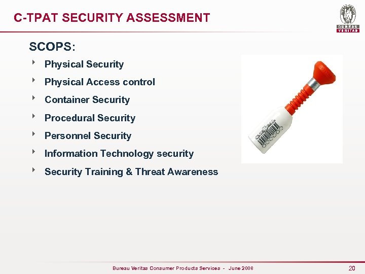 C-TPAT SECURITY ASSESSMENT SCOPS: 8 Physical Security 8 Physical Access control 8 Container Security 8 Procedural Security 8 Personnel Security 8 Information Technology security 8 Security Training & Threat Awareness Bureau Veritas Consumer Products Services - June 2008 20