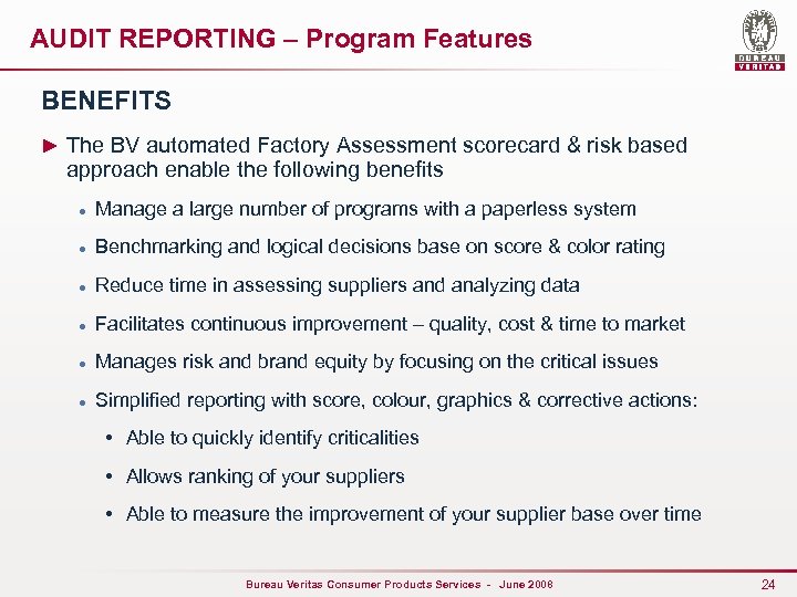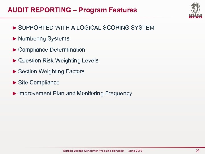 AUDIT REPORTING – Program Features ► SUPPORTED WITH A LOGICAL SCORING SYSTEM ► Numbering Systems ► Compliance Determination ► Question Risk Weighting Levels ► Section Weighting Factors ► Site Compliance ► Improvement Plan and Monitoring Frequency Bureau Veritas Consumer Products Services - June 2008 23