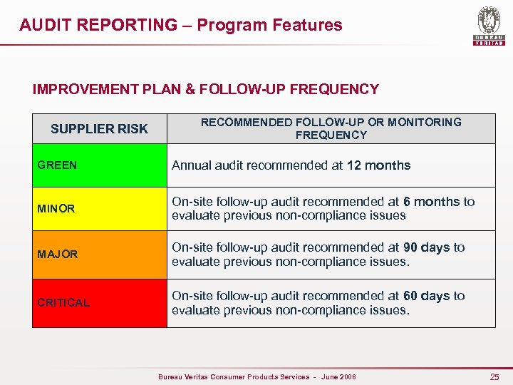 AUDIT REPORTING – Program Features BENEFITS ► The BV automated Factory Assessment scorecard & risk based approach enable the following benefits l Manage a large number of programs with a paperless system l Benchmarking and logical decisions base on score & color rating l Reduce time in assessing suppliers and analyzing data l Facilitates continuous improvement – quality, cost & time to market l Manages risk and brand equity by focusing on the critical issues l Simplified reporting with score, colour, graphics & corrective actions: • Able to quickly identify criticalities • Allows ranking of your suppliers • Able to measure the improvement of your supplier base over time Bureau Veritas Consumer Products Services - June 2008 24